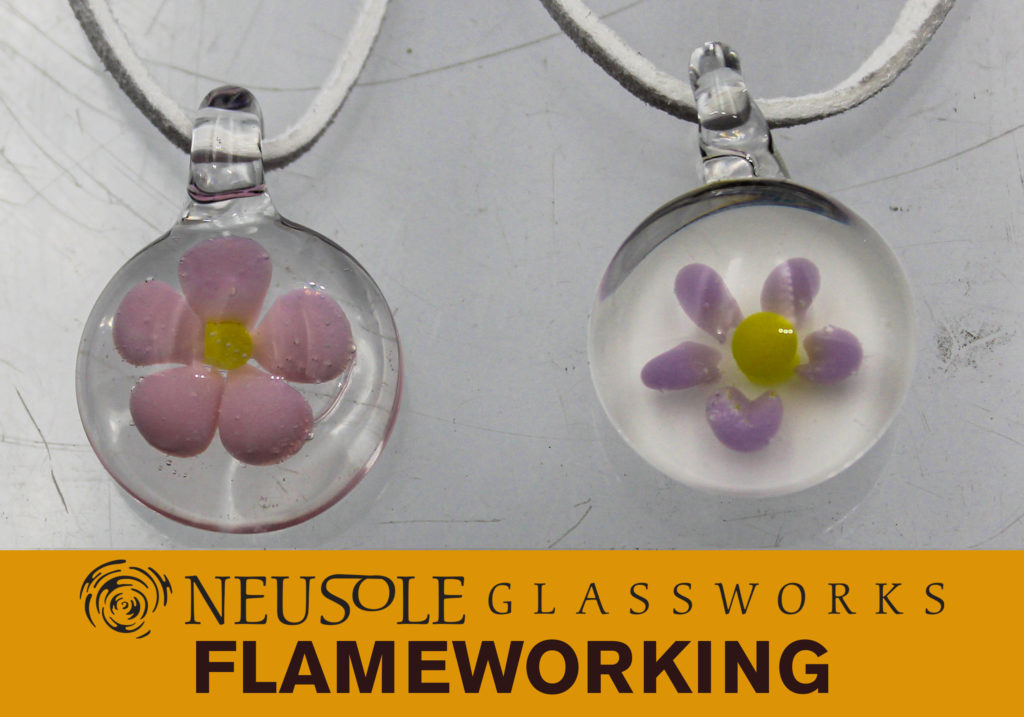In this flameworking class you will make a flower pendant! This class is for all levels and no prior experience is necessary. Ages 12 and older. Approximately 1 hour. $35 per person. Reservations required by phone (513-751-3292) or email (neusoleglassworks@hotmail.com) or in person. Payment required at time of scheduling. Available for pick-up in approx. 7 days.