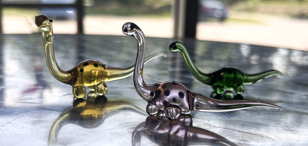In this flameworking class, you will make an adorable glass dinosaur! The figure is approx: 2.75” long – 1.5” tall. This class is for all levels, and no prior experience is necessary. Ages 12 and older. Approximately 1 hour. $35 per person. Reservations required by phone