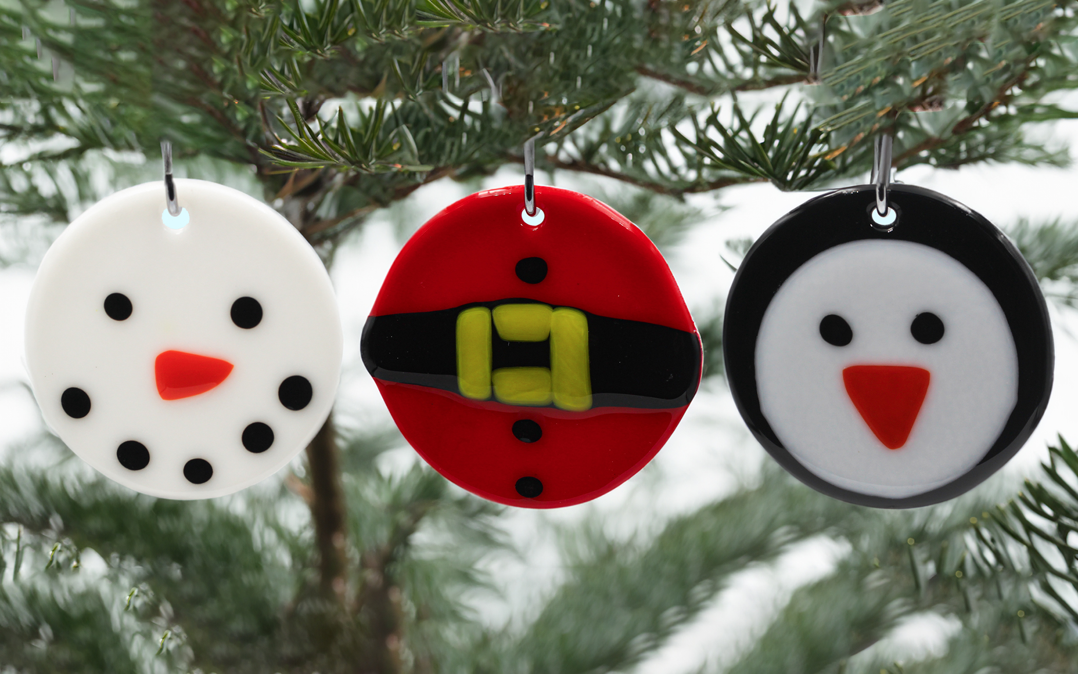 Adorable snowman face, Santa belt, and penguin face ornaments. Now through the end of December – 3 ornaments. Approximately 4” round with drilled hole for hook. All ages are welcome, no experience is needed.